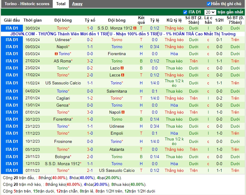 Kèo châu Âu cũng đang là sự ưu thế nhỏ cho các vị khách khi mức ăn của Torino đang là 2.21 trong khi đó con số này của Empoli đã là 3.40. Nhìn chung việc đang áp đảo trên các phương diện đội hình lẫn phong độ thi đấu sẽ tạo ra một đà tâm lý rất tốt để Torino hoàn toàn có thể làm chủ được trận đấu sắp tới. Sẽ là một kèo đấu mà Torino được kì vọng sẽ có thể dễ dàng có được 3 điểm trước Empoli .