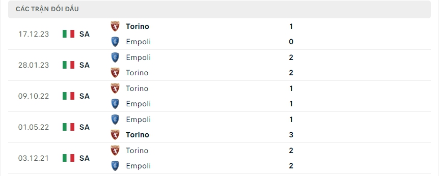 Lịch sử thi đấu của Empoli vs Torino