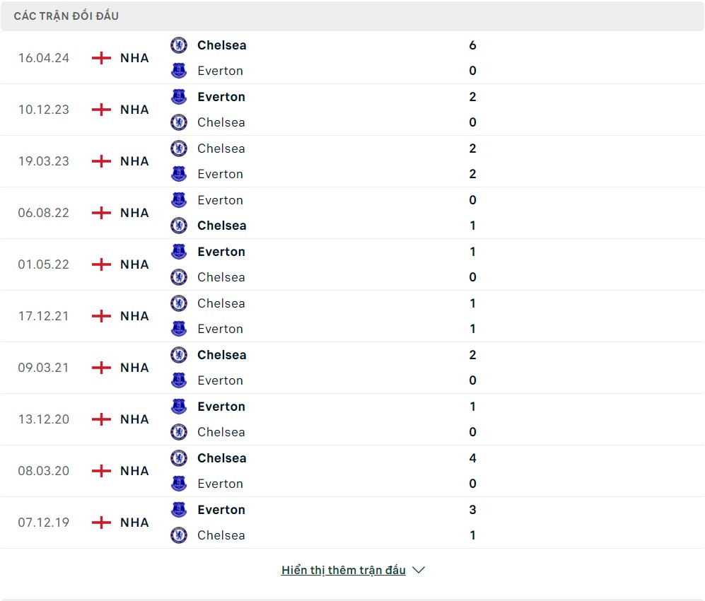 Lịch sử thi đấu của Everton vs Chelsea