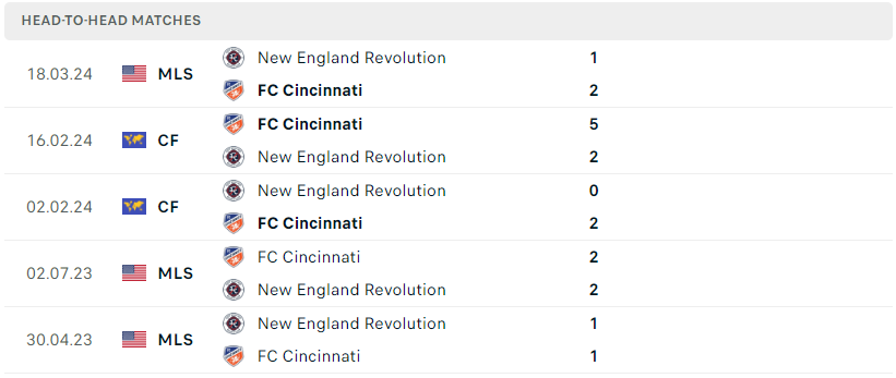 Thành tích đối đầu của FC Cincinnati vs New England Revolution