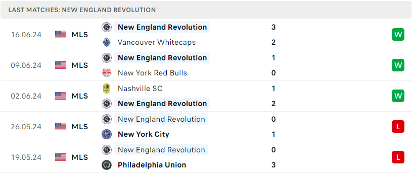 Bên phía đối diện, sau một khoảng thời gian dài thi đấu cập rập và thiếu ổn định, New England Revolution cũng đang có những động thái trở lại và bằng chứng là việc họ đã thắng 3 trận liên tiếp trước những đối thủ không hề yếu như Nashville SC, NY Red Bulls và cả Vancouver. Dù vậy, nhưng với điểm số ít ỏi NE Revolution hiện vẫn đang chôn chân ở vị trí cuối cùng trên BXH. Một tín hiệu khá tích cực và họ cần phải nắm bắt cơ hội này để sớm bứt phá trở lại.