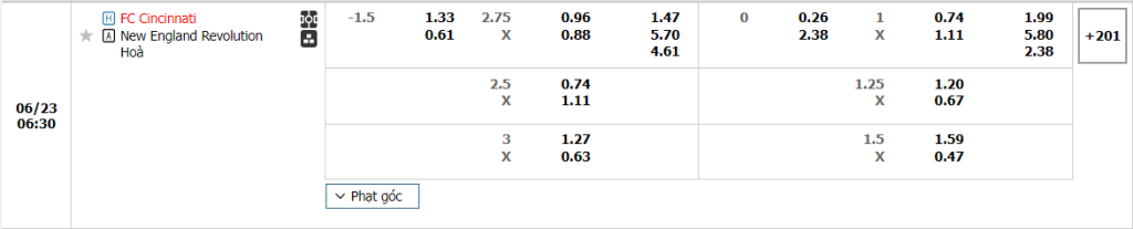 Bảng tỷ lệ kèo bóng đá trận đấu FC Cincinnati vs New England Revolution