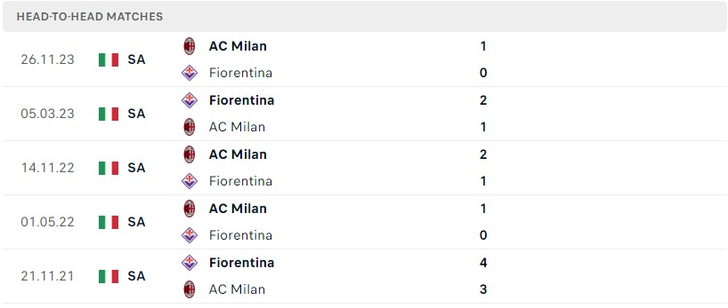 Thành tích đối đầu của Fiorentina vs AC Milan