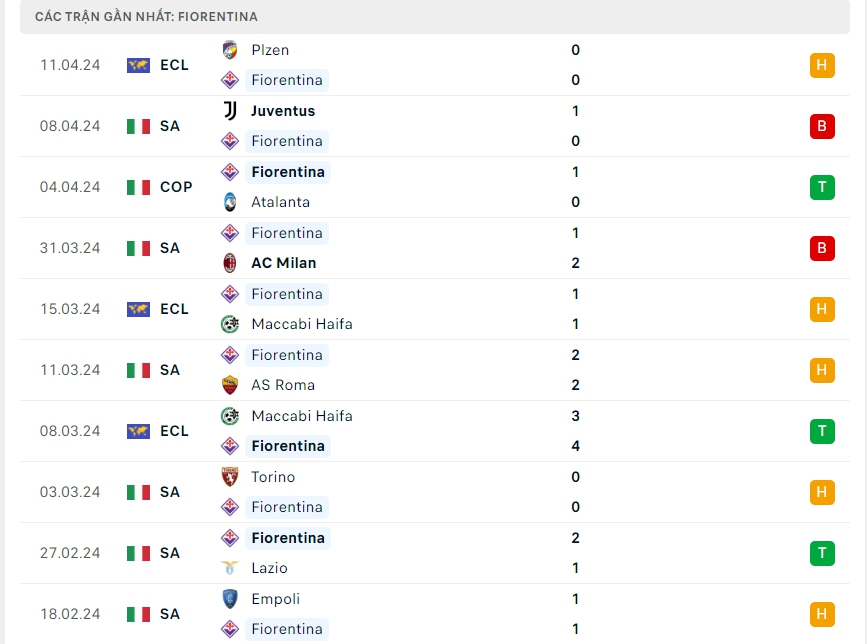Lịch sử thi đấu của Fiorentina vs Plzen