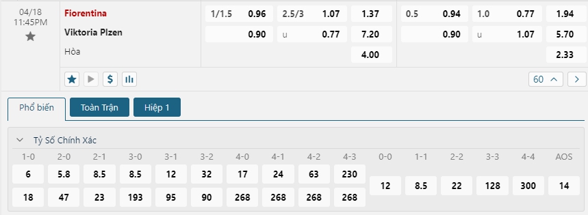 Kèo châu Âu cũng đang là sự ưu thế cho đội chủ nhà khi mức ăn của Fiorentina đang là 1.37 trong khi đó con số này của Plzen đã là 7.20. Sự chênh lệch là quá lớn về mặt sân bãi lẫn con người, Fiorentina sẻ có được một chiến thắng dễ trên sân nhà của mình.