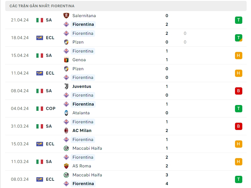 Phong độ đội bóng Fiorentina vs Sassuolo