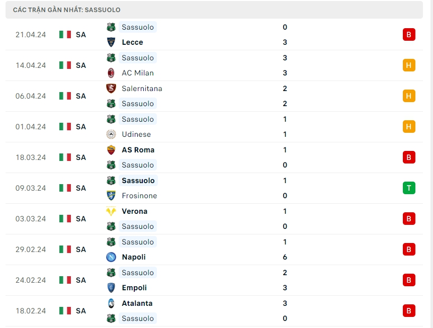 Trong khi đó với Sassuolo , đây được xem là mùa giải cực kỳ thất vọng với họ, trận thua vừa qua trước Lecce, là trận thua thứ 19 của họ ở mùa giải năm nay, với 26 điểm có được sau 33 lượt trận, họ có cho mình vị trí thứ 19 trên BXH, một vị trí trong nhóm cầm đèn đỏ và đang kém 2 điểm so với nhóm an toàn, tuy vậy với phong độ không tốt của hàng công cùng với hàng thủ thi đấu tệ khiến Sassuolo chưa thể vực dậy và ở trận đấu sắp tới khó khăn lại đến khi họ phải hành quân xa nhà.