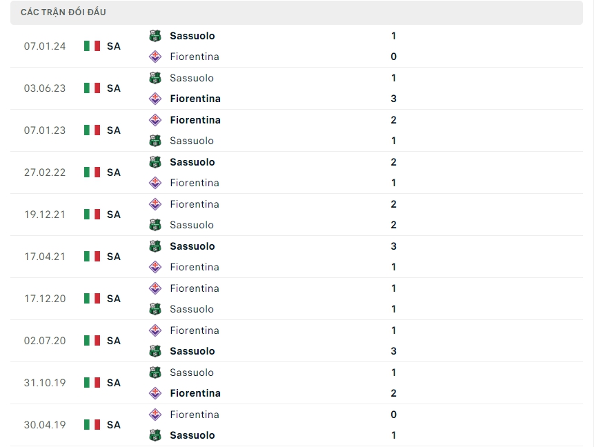 Lịch sử thi đấu của Fiorentina vs Sassuolo