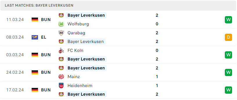 Trong khi đó với Die Werkself, tập thể này vẫn đang trình diễn một bộ mặt quá thăng hoa ở mùa giải năm nay và dường như việc phải thi đấu trên nhiều mặt trận không làm giảm đi nhuệ khí của họ. Tính từ đầu mùa, Leverkusen vẫn đang hoàn toàn bất bại trong tất cả 39 lần ra sân ở mọi mặt trận. Nếu cứ tiếp tục thi đấu với sự hưng phấn mất kiểm soát như hiện tại, chắc chắn đoàn quân Xabi Alonso sẽ là ứng viên số 1 cho chức vô địch mùa này, nhất là khi cách biệt giữa họ và Bayern Munich đã lên đến 10 điểm.
