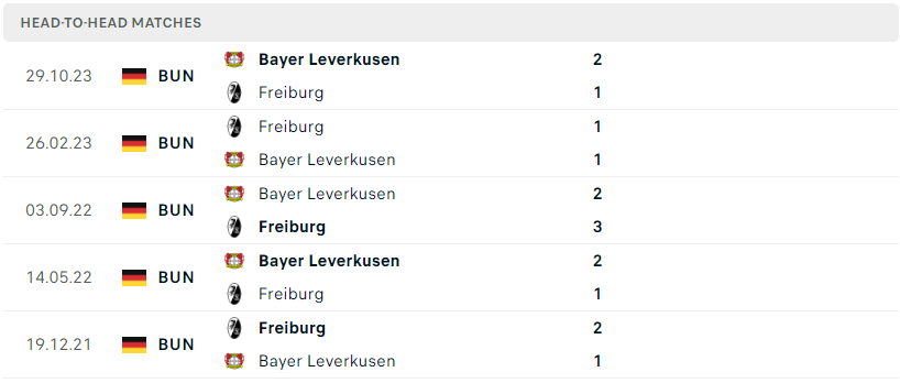 Thành tích đối đầu của Freiburg vs Bayer Leverkusen