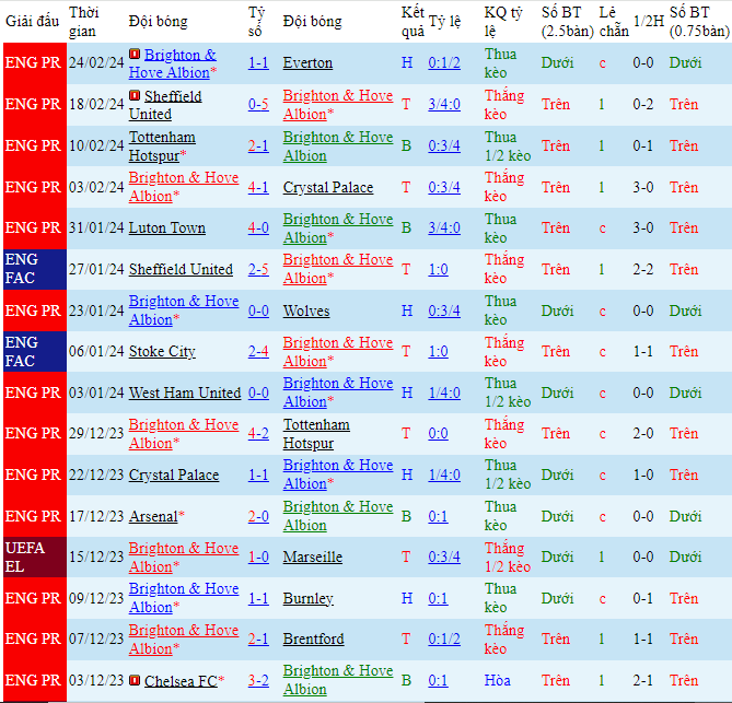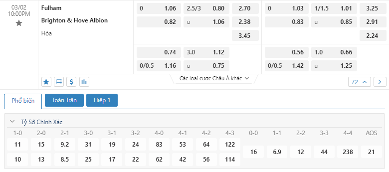 Kèo châu Âu cũng đang là sự ưu thế nhỏ cho các vị khách khi mức ăn của Brighton đang là 2.38 trong khi đó con số này của Fulham đã là 2.70. Sẽ là một trận đấu với thế trận tương đối giằng co khi cả hai đội sẽ sẵn sàng chơi sòng phẳng với nhau để tìm kiếm kết quả có lợi cho mình. Và với các lợi thế nhất định thì Brighton nhiều khả năng vẫn sẽ là cái tên có được niềm vui sau cùng.