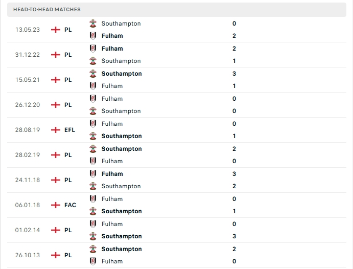 Lịch sử thi đấu của Fulham vs Southampton