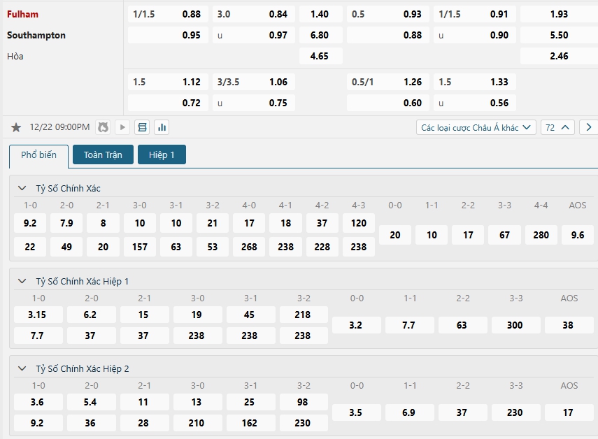 Kèo Châu Âu vẫn đang là sự vượt trội dành cho đội chủ sân Craven Cottage khi tỷ lệ cho chiến thắng của họ chỉ là 1.40 trong khi con số này bên phía các vị khách Southampton lên tới 6.80, Bấy nhiêu là đủ cho thấy sự khác biệt, ưu thế sân nhà, chất lượng đội hình cùng với những màn trình diễn tốt trên sân nhà sẻ giúp Fulham tự tin hướng đến chiến thắng.