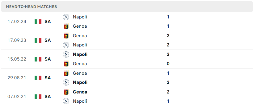 Sự cân bằng thêm một lần nữa được thể hiện ở thành tích đối đầu, cụ thể ở 2 cuộc chạm trán mùa giải trước Genoa đã xuất sắc cầm chân Napoli cả 2 lần. Điều này cho thấy, ‘Điểu sư’ vẫn luôn là đối thủ khó chịu với đội bóng vùng Naples. Với tình hình phong độ và cục diện ở hiện tại, việc phải làm khách sẽ hạn chế sức mạnh của Napoli và chính nhờ điều đó, Genoa sẽ có thể giữ lại 1 điểm chung cuộc.