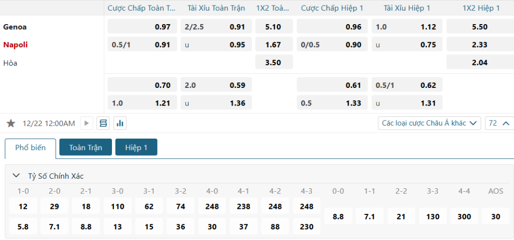 Soi kèo Châu Á, kèo chấp Genoa vs Napoli