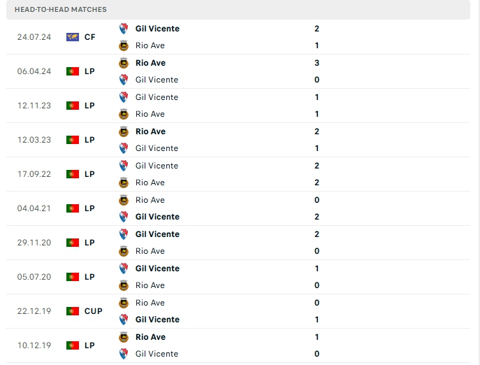 Lần đón tiếp Rio Avetrên sân nhà của Gil Vicente khi đó Gil Vicente đánh bại đối thủ với tỷ số 2-1, và lần chạm mặt lần này họ cũng đang đặt quyết tâm cao để có được chiến thắng, 3 điểm sẻ giúp Gil Vicente cải thiệt vị trí trên BXH, đặc biệt là vượt mặt chính Rio Ave để vào top 10.