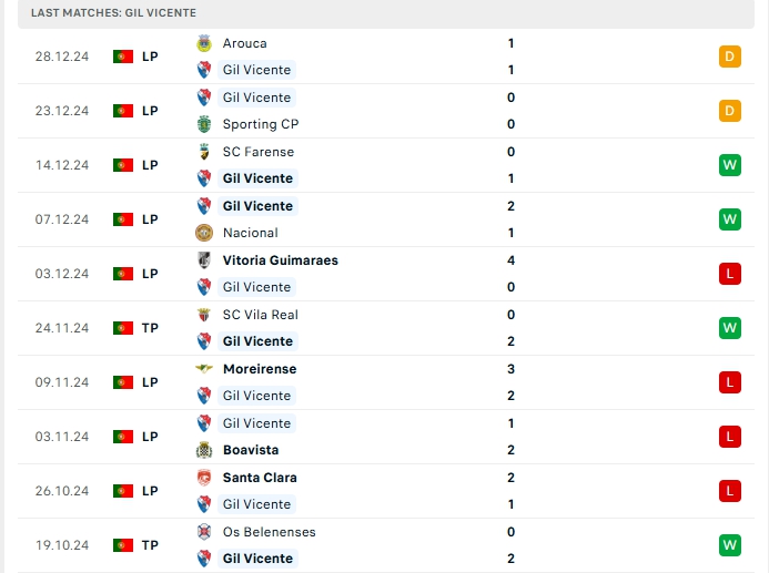 Gil Vicente vừa qua có được trận hòa trước Arouca, đây là trận thứ 4 bất bại của họ với 2 chiến thắng cùng 2 hòa, trải qua 16 lượt trận, Gil Vicente có cho mình 4 chiến thắng, 6 hòa cùng 6 thất bại, mang về 18 điểm và đang xếp vị trí thứ 11 trên BXH, hàng công của Gil Vicente có được 18 bàn thắng cùng hàng thủ nhận 25 bàn thua, 3/5 trận vừa qua của Gil Vicente khép lại không quá 2 bàn, trên sân nhà của mình Gil Vicente mang về 11 bàn thắng cùng hàng thủ nhận 6 bàn thua sau 7 trận đấu.