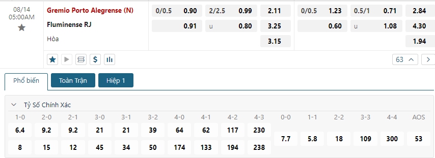 Kèo châu Âu chắc chắn là sự ưu thế cho chủ nhà Gremio khi mức ăn của họ đang là 2.11 và đội khách Fluminense là 3.25, Ưu thế sân nhà cùng phong độ tốt trong những lần đối đầu với Fluminense là cơ sở để Gremio hướng đến chiến thắng trong trận đấu này qua đó tạo lợi thế trước đối thủ cho trận lượt về.