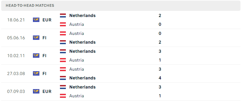 Thành tích đối đầu của Hà Lan vs Áo