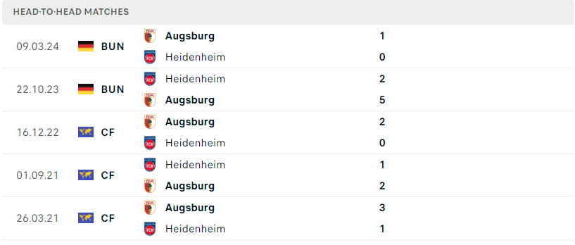 Thành tích đối đầu của Heidenheim vs Augsburg