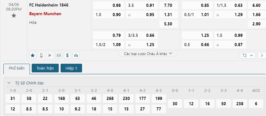 Kèo châu Âu cũng đang là sự ưu thế cho các vị khách khi mức ăn của Bayern Munich đang là 1.31 trong khi đó con số này của Heidenheim đã là 7.70. Một khoảng thời gian vô cùng khó khăn và hơn lúc nào hết Bayern Munich sẽ cần phải có được sự quyết tâm vươn lên cùng với đó là những giải pháp để đưa mình trở lại với guồng quay hiện tại. Dù khó khăn những chắc chắn hùm xám sẻ trở lại với chiến thắng trong trận đấu này.