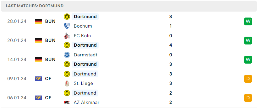 Trong khi đó, một cái tên khác cũng đang thi đấu cực kỳ thăng hoa trong năm mới là Dortmund, thắng lợi đầy thuyết phục trước Bochum vừa qua đã là trận thắng thứ 3 liên tiếp, đồng thời cũng chính là trận bất bại thứ 8 của tập thể vùng Ruhr. Một thời điểm đoàn quân Edin Terzic không cần phải gồng mình thi đấu tại Champions League đang giúp cho họ có thể thể hiện tối đa sức mạnh tại giải quốc nội. Làm khách trước Heidenheim có thể sẽ là cơ hội để họ tiếp tục nối dài mạch thắng.