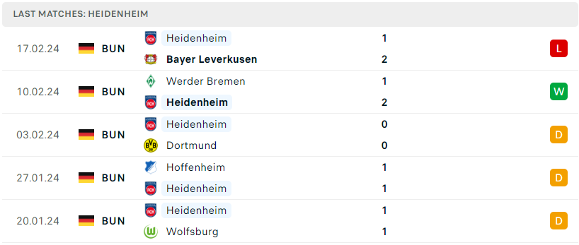 Mạch 10 trận bất bại liên tiếp của Heidenheim cũng vừa bị chặn lại bởi trận thua tương đối đáng tiếc trước “hiện tượng” Leverkusen ở vòng đấu trước. Mặc dù vậy, nhưng xét một cách tổng thể màn trình diễn của đoàn quân Frank Schmitt trong mùa giải đầu tiên tại Bundesliga vẫn là hết sức đáng khen. Họ hiện đang đứng ở vị trí thứ 10 và vẫn liên tục duy trì thế bám đuổi với nhóm giành vé dự cup Châu Âu. Màn tiếp đón Frankfurt sắp tới đây được xem là liều thuốc thử cần thiết dành cho họ.