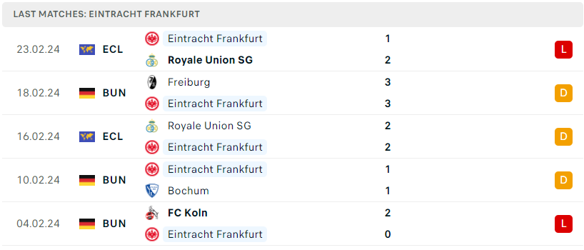 Trong khi đó với Frankfurt, tập thể này đang trải qua khoảng thời gian tương đối khó khăn, minh chứng là việc họ đã không thắng trong 5 lần ra sân gần nhất và đồng thời cũng đã phải nói lời chia tay đấu trường Conference League. Dù đoàn quân Dino Toppmöller vẫn đang duy trì được một vị trí trong top 6, tuy nhiên nếu cứ tiếp tục thi đấu với sự thiếu ổn định như hiện tại thì thứ hạng của họ chắc chắn sẽ còn tiếp tục rơi rớt và bị đe dọa trong tương lai.