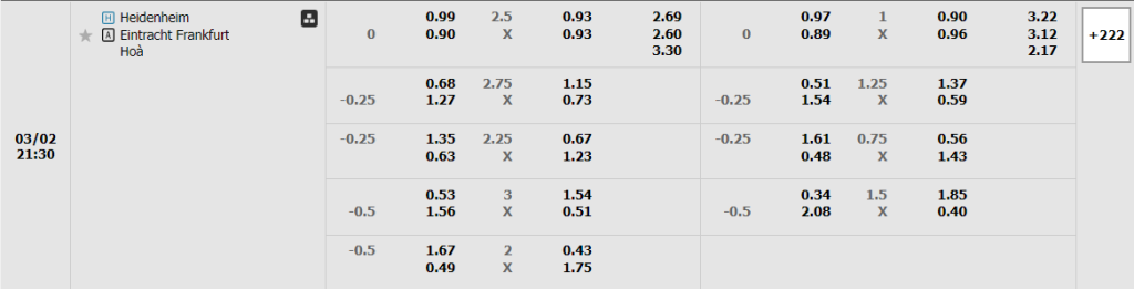 Bảng tỷ lệ kèo bóng đá trận đấu Heidenheim vs Eintracht Frankfurt
