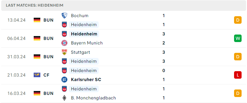 Sau khi gây bất ngờ với chiến thắng 3-2 trước nhà ĐKVĐ Bayern Munich, Heidenheim tiếp tục cho thấy sự lì lợm bằng trận hòa trước Bochum và qua đó nâng chuỗi trận bất bại liên tiếp tại Bundesliga lên thành con số 4. Dù đây chỉ mới là mùa giải đầu tiên mà Heidenheim góp mặt tại sân chơi lớn nhất nước Đức, tuy nhiên họ lại chẳng tỏ ra thua thiệt quá nhiều và thậm chí đang đứng ở nửa trên BXH. Đụng độ đối thủ mạnh RB Leipzig được xem là cơ hội nữa để họ cọ xát và tiếp tục tiến bộ.
