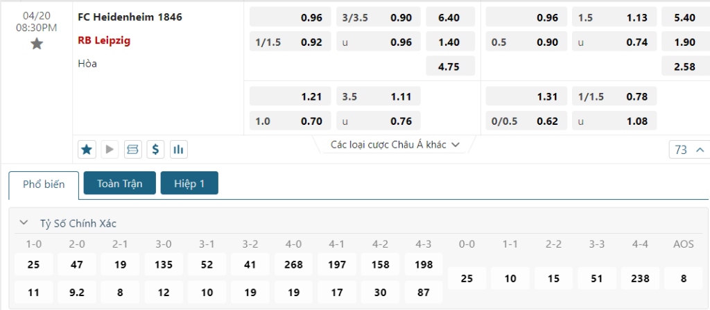 Kèo Châu Âu chắc chắn là sự ưu thế dành cho RB Leipzig, khi mức ăn của họ chỉ là 1.40 và con số này của đội chủ nhà là 6.40. Về cơ bản, trong tình cảnh mà đoàn quân Marco Rose buộc phải thắng nếu muốn nghĩ đến tấm vé dự C1 thì tin chắc rằng một tân binh vừa lên hạng như Heidenheim sẽ khó có thể làm khó được RB Leipzig.