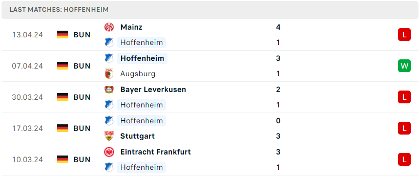 Tưởng chừng như với chiến thắng 3-1 trước Augsburg, Hoffenheim sẽ phần nào tìm lại sự tự tin và sớm trở lại trong phần còn lại của mùa giải. Tuy nhiên, mọi thứ lại không được thuận lợi như vậy khi họ phải chạm mặt Mainz và phải nhận trận thua thê thảm 1-4. Phong độ của Hoffenheim vào lúc này là rất bết bát khi họ chỉ thắng 1/5 vòng đấu gần nhất. Dù đã chắc một suất trụ hạng nhưng đoàn quân Matarazzo cũng phải cho thấy được vị thế và thực lực trước khi mùa giải khép lại.