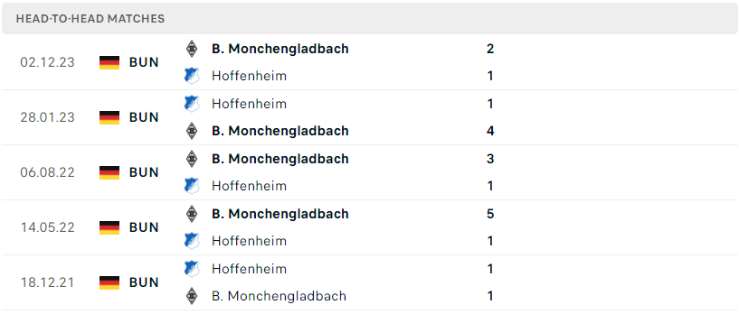 Thành tích đối đầu của Hoffenheim vs B. Monchengladbach