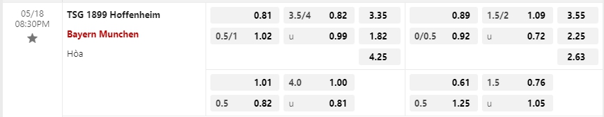 Kèo châu Âu cũng đang là sự ưu thế cho đội khách khi mức ăn của Bayern Munich đang là 1.82 trong khi đó con số này của Pellegrino Matarazzo và các họ trò đã là 3.35. Dù phải thi đấu xa nhà nhưng rỏ ràng Bayern Munich đặt mục tiêu có được 3 điểm để khép lại mùa giải ở vị trí thứ 2 chung cuộc khi họ chỉ đang hơn đối thủ xếp phía sau chỉ 2 điểm, động lực đó sẻ giúp Bayeern có cho mình chiến thắng trong trận đấu tới.