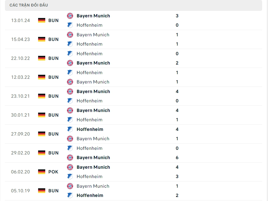 Lịch sử thi đấu của Hoffenheim vs Bayern Munich