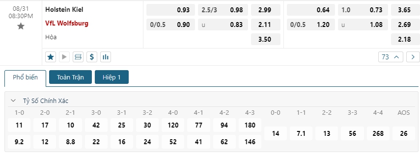 Kèo châu Âu cũng đang là sự ưu thế cho các vị khách khi mức ăn của họ đang là 2.1 trong khi đó con số này của chủ nhà Holstein Kiel là 2.99. Chênh lệch dù không quá lớn nhưng với thực lực cùng kinh nghiệm thi đấu dày dạng, cùng lịch sử đối đầu vượt trội sẻ là cơ sở để đặt niềm tin vào Wolfsburg trong trận đấu này.