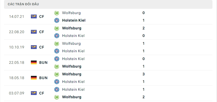 Lịch sử thi đấu của Holstein Kiel vs Wolfsburg