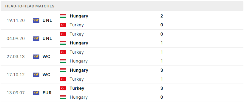 Thành tích đối đầu của Hungary vs Thổ Nhĩ Kỳ