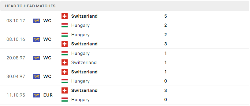 Thành tích đối đầu của Hungary vs Thuỵ Sỹ