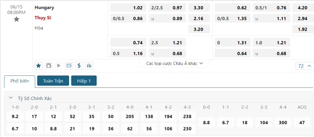 Soi kèo Châu Á, kèo chấp Hungary vs Thuỵ Sỹ