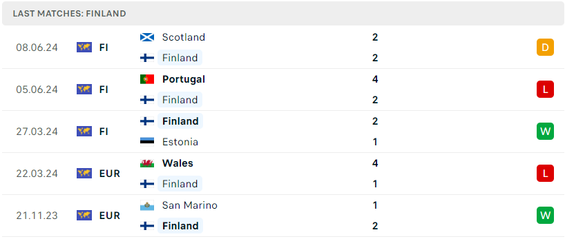 Bên phía đối diện, Phần Lan cũng tương tự Hy Lạp khi tập thể này cũng chỉ kém nhóm giành vé dự VCK Euro 2024 đúng 4 điểm. Màn trình diễn của Phần Lan dưới thời Markku Kanerva quả thật là rất đáng khen, trong 3 trận đấu giao hữu gần nhất họ cũng chỉ thua mỗi Bồ Đào Nha, thắng Estonia và hòa Scotland. Những kết quả này cho thấy Phần Lan đang duy trì phong độ ổn định và sẵn sàng cạnh tranh mạnh mẽ tại Nations League.