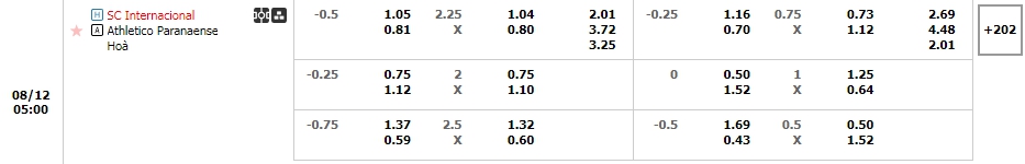 Bảng tỷ lệ kèo bóng đá trận đấu Internacional vs Athletico-PR