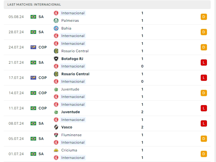 Internacional vừa có trận hòa trước Palmeiras, đây là trận không thắng thứ 11 liên tiếp của họ, trải qua 16 lượt trận với 5 chiến thắng, 6 hòa và 5 thất bại, có được 21 điểm vàđang xếp vị trí thứ 16 trên BXH, hàng công của Internacional có cho mình 14 bàn thắng, bên cạnh hàng thủ nhận 14 bàn thua, trên sân nhà của mình Internacional có cho mình 5 bàn thắng, cùng với hàng thủ nhận 8 bàn thua ở 5 trận gần nhất , Việc hàng công và thủ đang chơi tệ khiến Internacional đang gặp nhiều khó khăn ở mùa giải năm nay.