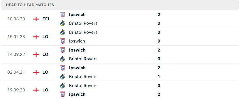 Thành tích đối đầu của Ipswich vs Bristol Rovers