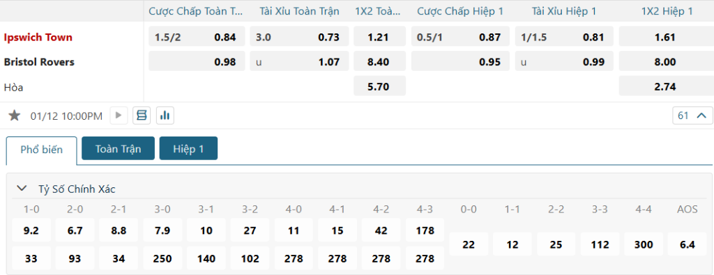 Kèo Châu Âu hiện vẫn đang là sự nhỉnh hơn hoàn toàn dành cho Ipswich, khi mức ăn của họ chỉ là 1.21, trong khi con số này của đội khách lên đến 8.40. Với những lợi thế có được về thực lực, kinh nghiệm cho đến sân bãi, sẽ chẳng có lý gì một Bristol Rovers đang vô cùng bết bát và phải đối mặt với việc xuống League Two lại có thể cản bước The Tractor Boys đang có dấu hiệu trở lại.