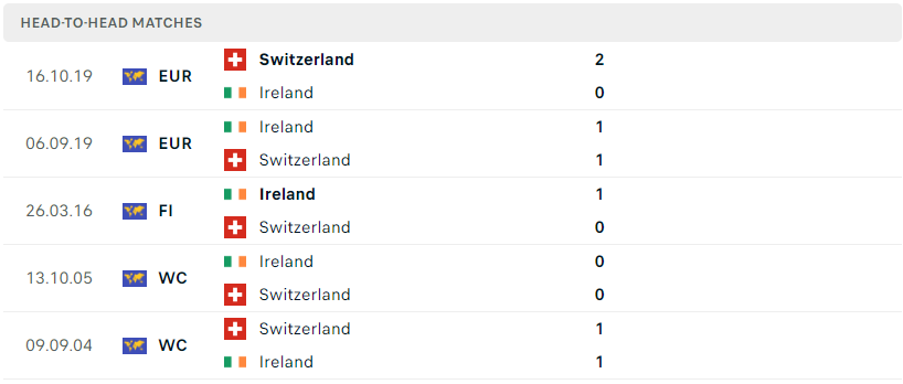 Thành tích đối đầu của Ireland vs Thụy Sĩ