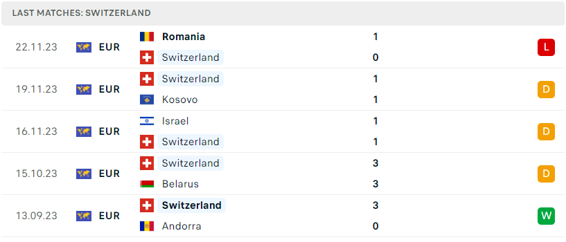 Phía bên kia, dù đã thuận lợi vượt qua vòng loại Euro 2024, thế nhưng màn trình diễn của Thụy Sĩ là chưa thật sự quá thuyết phục. Họ chỉ kết thúc chiến dịch với vị trí thứ 2 và kém đội đầu bảng Romania đến 4 điểm. Chưa kể, trong 4 trận đấu gần nhất kể từ tháng 10 năm 2023 thì thầy trò Murat Yakin không một lần nếm mùi chiến thắng. Một phong độ rất đáng lo ngại dành cho tập thể sắp tham dự VCK Euro tại Đức vào tháng 6 tới.