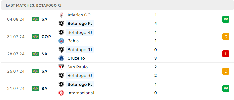 Bên phía kia, càng thi đấu Botafogo càng khẳng định vị thế và sức mạnh của một ông lớn của bóng đá Brazil. Chiến thắng 4-1 trước một tân binh khác là Atletico GO là lời khẳng định đanh thép cho thực lực và tham vọng đua vô địch của tập thể này. Sau 21 vòng đấu, binh đoàn trắng đen hiện vẫn dẫn đầu BXH với 43 điểm. Dù vậy, nhưng khi mọi thứ chưa ngã ngũ thì họ cần phải tiếp tục tạo ra cách biệt và không đi vào vết xe đổ như mùa giải trước.