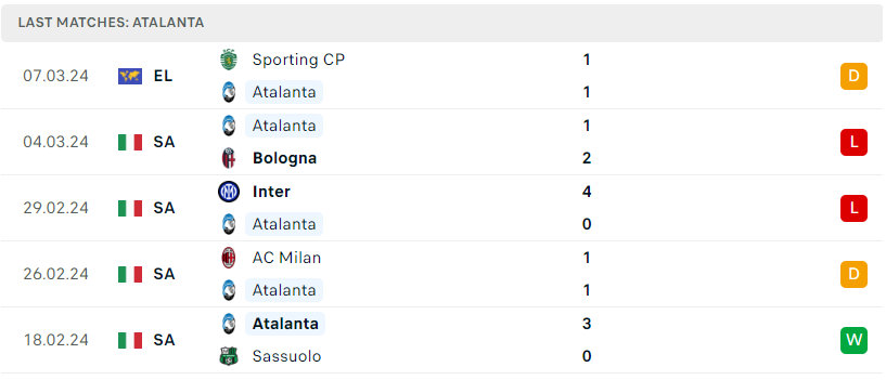 Bên phía đối diện, tưởng chừng như với 2 thất bại liên tiếp trước Bologna và Inter Milan sẽ khiến Atalanta bước vào chuyến làm khách đến Sporting Lison bằng một thất bại. Tuy nhiên, với bản lĩnh và thực lực thì họ vẫn biết cách giữ lại một trận hòa. Dù đã trải qua đến 3 vòng đấu liên tiếp không thắng tại Serie A nhưng với sự hồi sinh trước đó thì La Dea hiện cũng chỉ kém vị trí top 4 đúng 5 điểm. Điều đó cho thấy, Atalanta vẫn là một đối thủ đáng gườm và không dễ dàng bị loại khỏi cuộc đua.