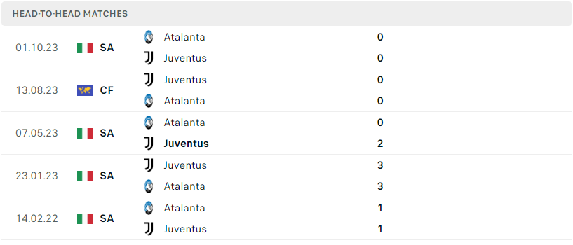 Lịch sử thi đấu vẫn đang dừng lại ở mức cân bằng khi trong 5 lần đụng độ gần nhất thì đã có đến 4 trận đấu bất phân thắng bại. Quay trở về hiện tại, với phong độ và sự xuống dốc của Juventus thì chắc chắn Atalanta hoàn toàn có đủ cơ sở và lý do để khiến Lão Bà gặp khó. Sự ổn định cùng khả năng vượt khó ấn tượng sẽ là chìa khóa mở ra một chiến thắng tối thiểu ngay trên sân khách dành cho La Dea.